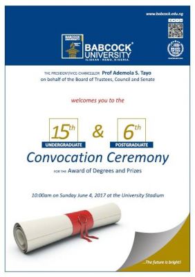 Babcock University, Ilishan Remo, Ogun State, a private Christian co-educational Nigerian university owned and operated by the Seventh-day Adventist Church in Nigeria, invites graduands, parents/guardians and the public to it 15th undergraduate and 6th postgraduate convocation ceremonies scheduled to hold as follows:
