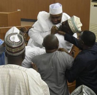 An overjoyous Dino Melaye lifted up his colleague and Senate President, Bukola Saraki, moments after the chairman of the Code of Conduct Tribunal CCT, Danladi Umar, discharged and acquitted him of all the 18-charges of false assets declaration leveled against him by the Federal government.